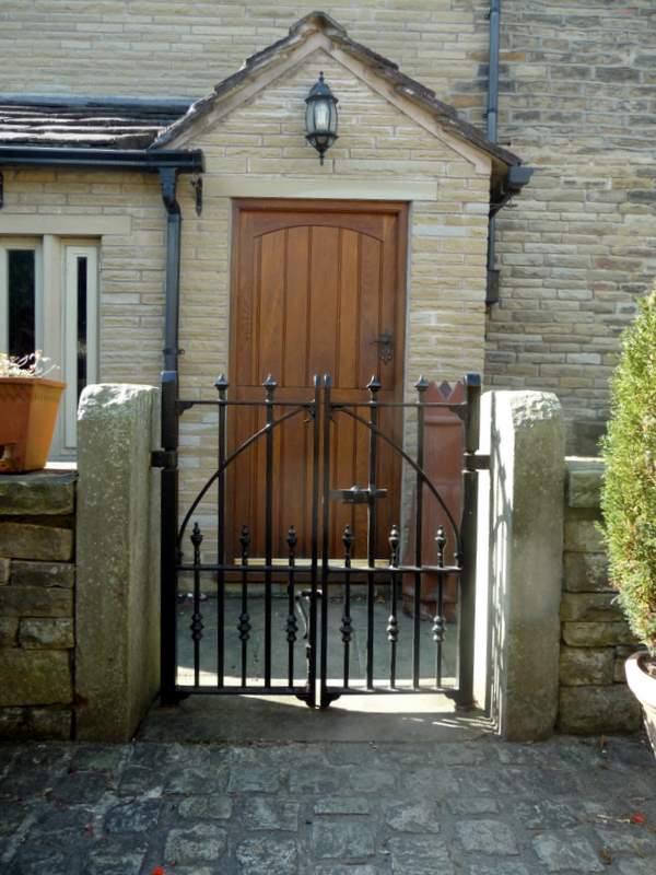 Featuring a Gothic arch insert, traditional hinge resin fixed to masonry, sliding latch and drop bolt.